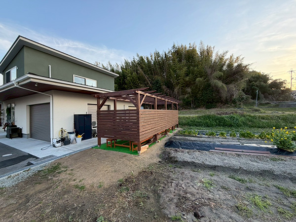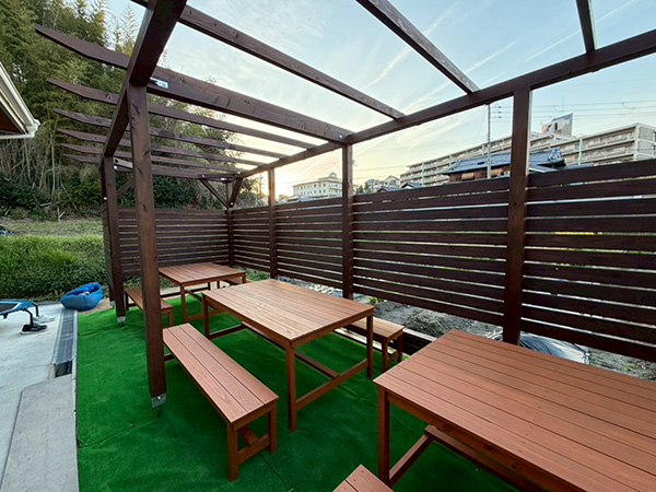 施主様より「生徒が屋外でも学べるスペースをつくりたい」とのご要望をいただき、日差しをやわらかく遮りながら、快適に過ごせる空間をご提案しました。