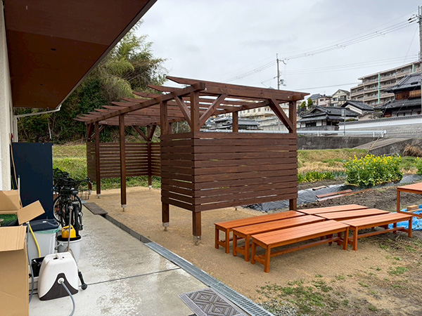 学習塾様の敷地内に、パーゴラ(藤棚)を設置させていただきました。