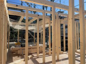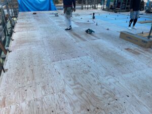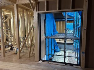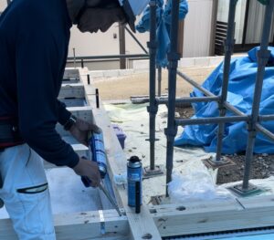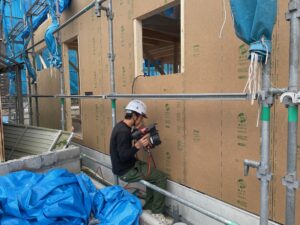 棟上げの後、外壁部分に合板やサッシ枠を取り付けていきます。