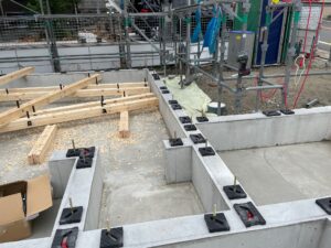 まず、アンカーボルトの部分にパッキンを置き、その上に土台を敷きます。