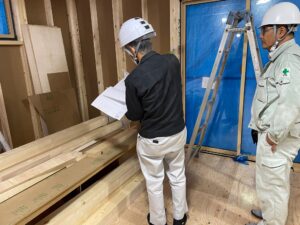 ここでは建物の配置や高さや、構造図通りに金物が使用されているかを検査員に確認していただきます。