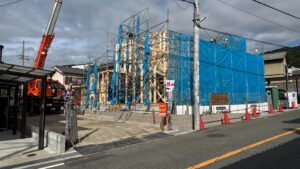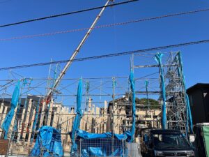 クレーンを使って資材を運搬しながら、2階部分を組み立てていきます。